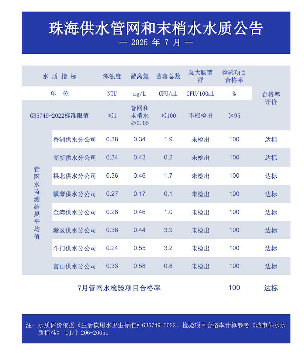 2025年7月珠海供水管网和末梢水水质公告