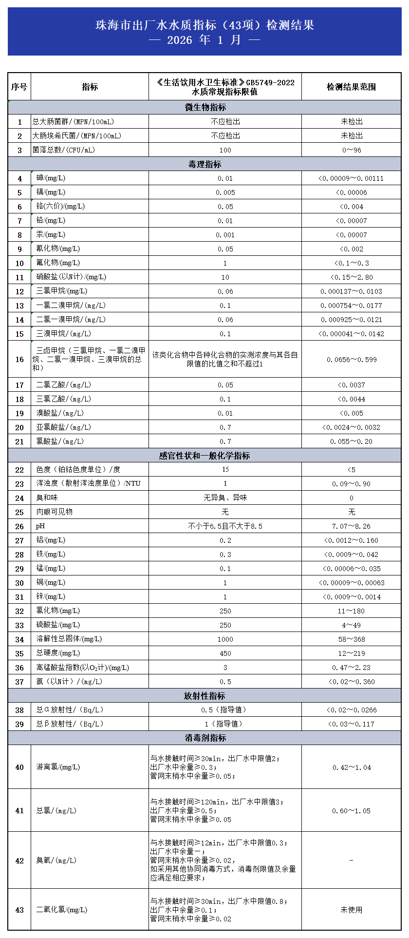 2026年1月珠海市出厂水水质指标(43项)检测结果