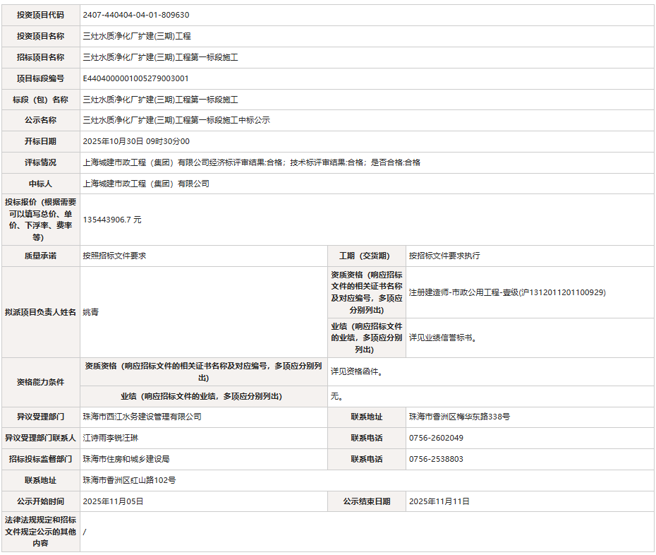 三灶水质净化厂扩建(三期)工程第一标段施工中标公示